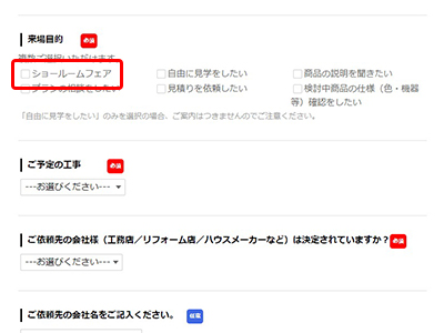 【事前web予約の流れ】 ①お近くのショールームページを開き、「予約リクエストWebフォーム」をクリック ②お施主様(個人のお客様)をクリック ③必要事項を入力し、『来場目的』項目で、「ショールームフェア」にチェックを入れてください。