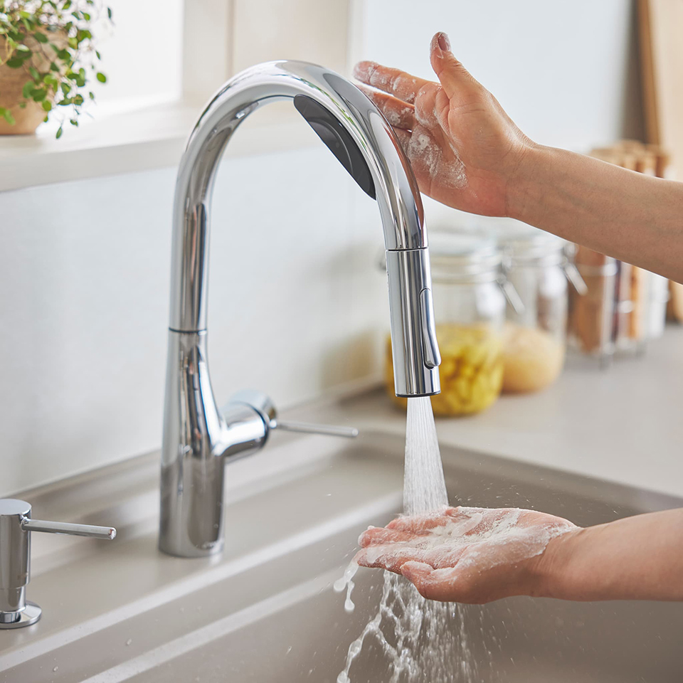 左右のセンサーに手をかざすだけで、触れることなく清潔&手軽に水栓をオン・オフ。