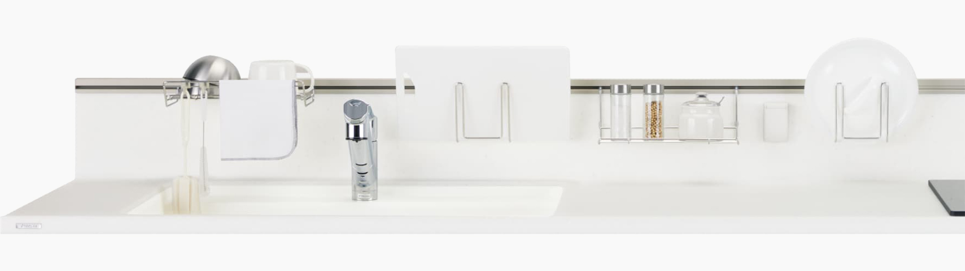 標準装備のハンガーアイテムで、キッチングッズを浮かせ置きできるので、お手入れ・調理がスムーズに。