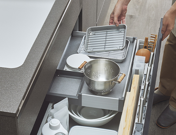 【シンク下スペース】連動イン引出し「ステップドロワー」で、使用頻度や高さの違いに応じてゾーンを分けて収納できます。 -