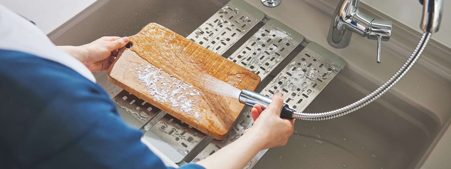 汚れがちな作業も、シンク上ならすぐに洗い流せるので、気兼ねなく使えます。
