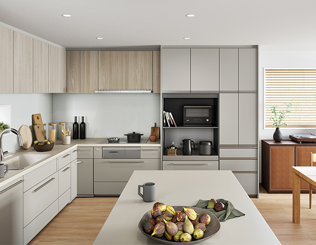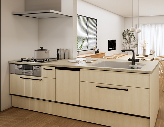 毎日の料理やお手入れがはかどる機能性と、住宅にフィットする柔軟性を兼ね備えた、くらしも気持ちも"ととのう"キッチン。