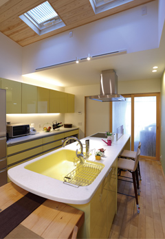 キッチンには開閉できる天窓を設置。自然を感じながら料理ができると奥様も大喜び。