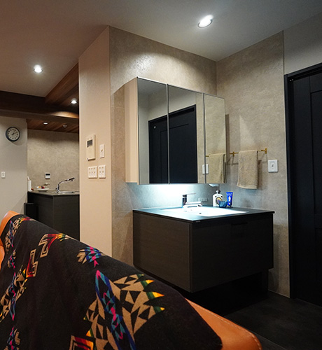 ヴィンテージモダンなLDK。使いやすい洗面の配置。