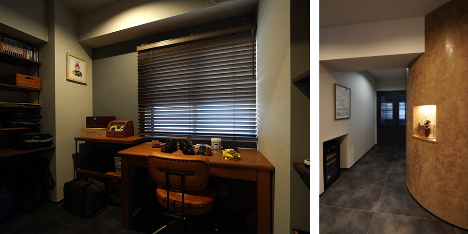 アトリエは好きがいっぱい詰まった落ち着く空間。 / 梁や柱を隠したイタリア漆喰のアール壁。ワインセラーの設置場所に工夫を凝らした。
