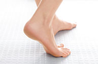 表面温度5℃の床材に15 秒立った足の裏のサーモグラフ。従来品(右)と、やわらぐフロア(左)では約5℃ の違いがあります。