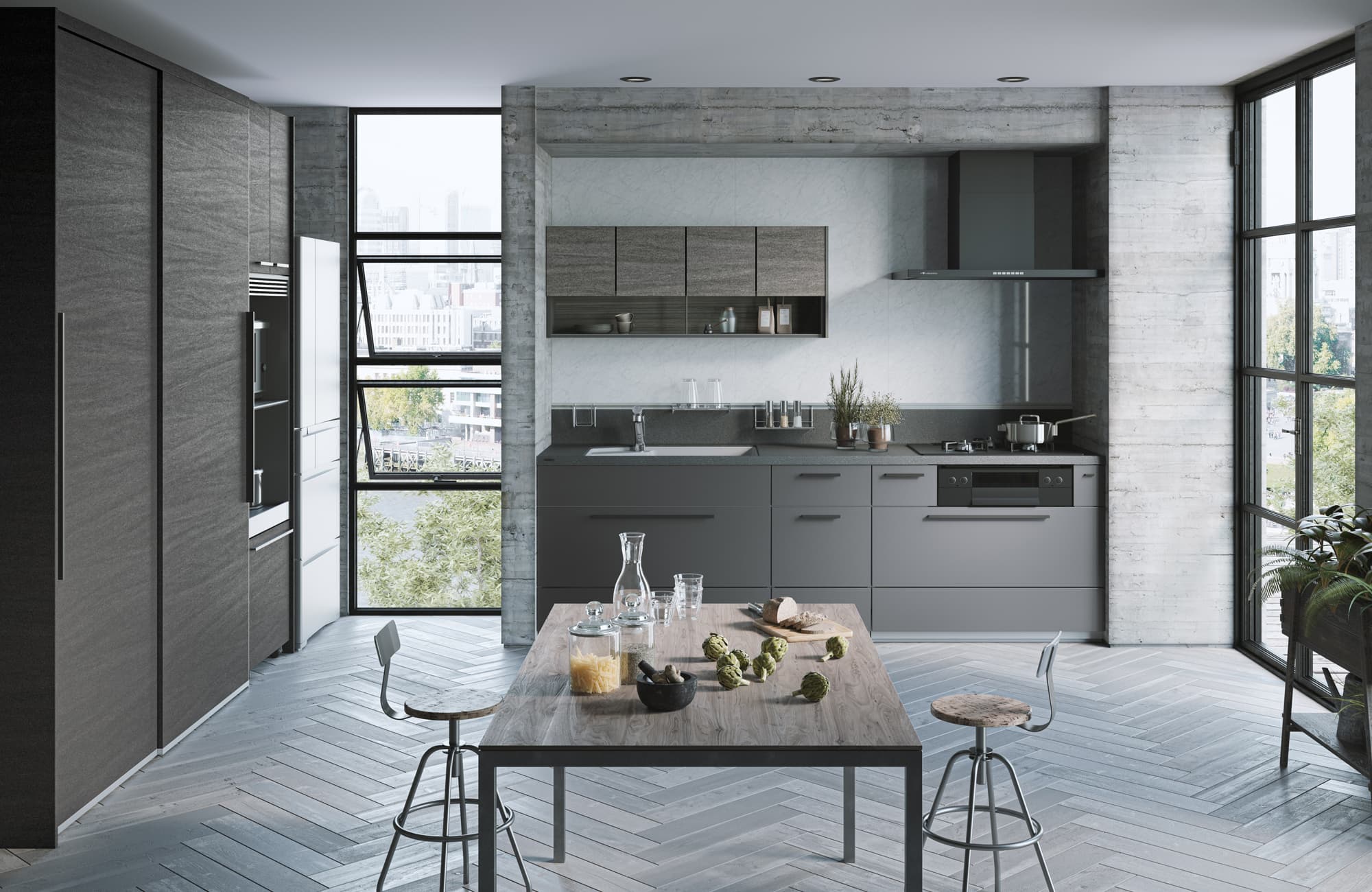 カウンター、扉は「メテオダークグレー」で統一し、深みのあるダークカラーとシルバードットのきらめきが調和する都会的な印象に。